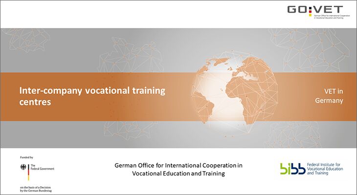 This GOVET presentation provides interested parties from Germany and abroad with information about inter-company vocational training centres (ÜBS). It outlines the tasks and objectives of inter-company vocational training centres and also offers insights into their financing and the underlying legal basis.