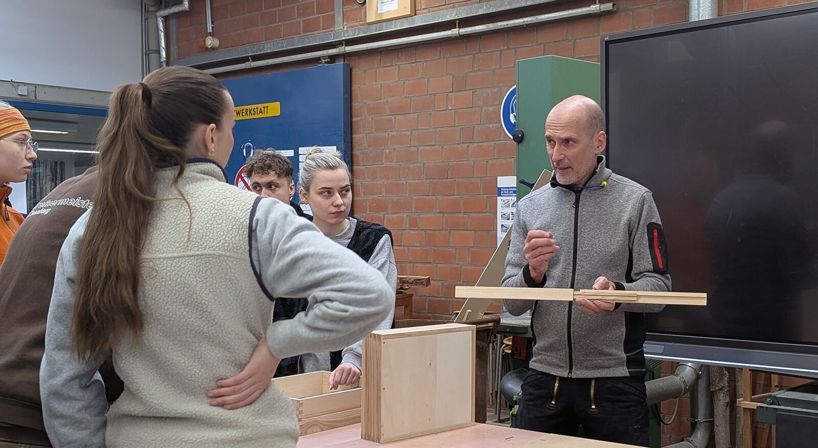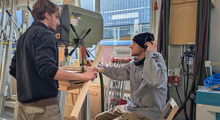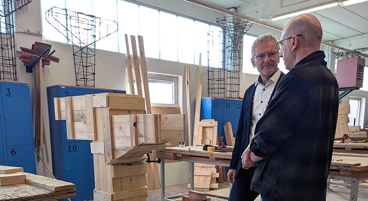 Ein besonderer Höhepunkt war die Begegnung mit Auszubildenden in den Holzwerkstätten. Beide Unternehmer zeigten sich sehr beeindruckt von den technischen Fähigkeiten und der Professionalität der jungen Menschen. Auch das Engagement der Ausbilderinnen und Ausbilder hob Haberfeld besonders hervor: Wie sie die Lernenden intensiv begleiten und damit die hohe Qualität des dualen Ausbildungssystems sichtbar machen.